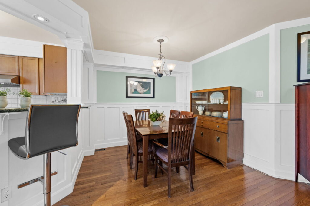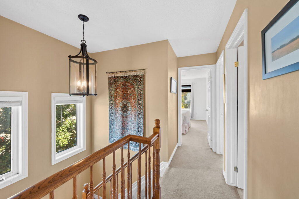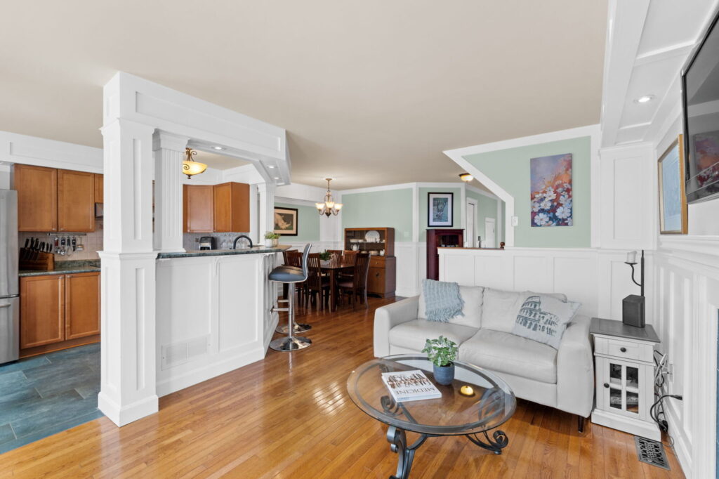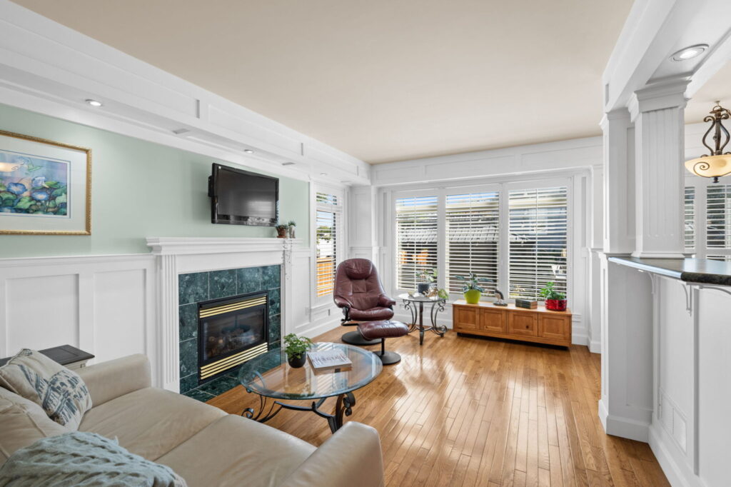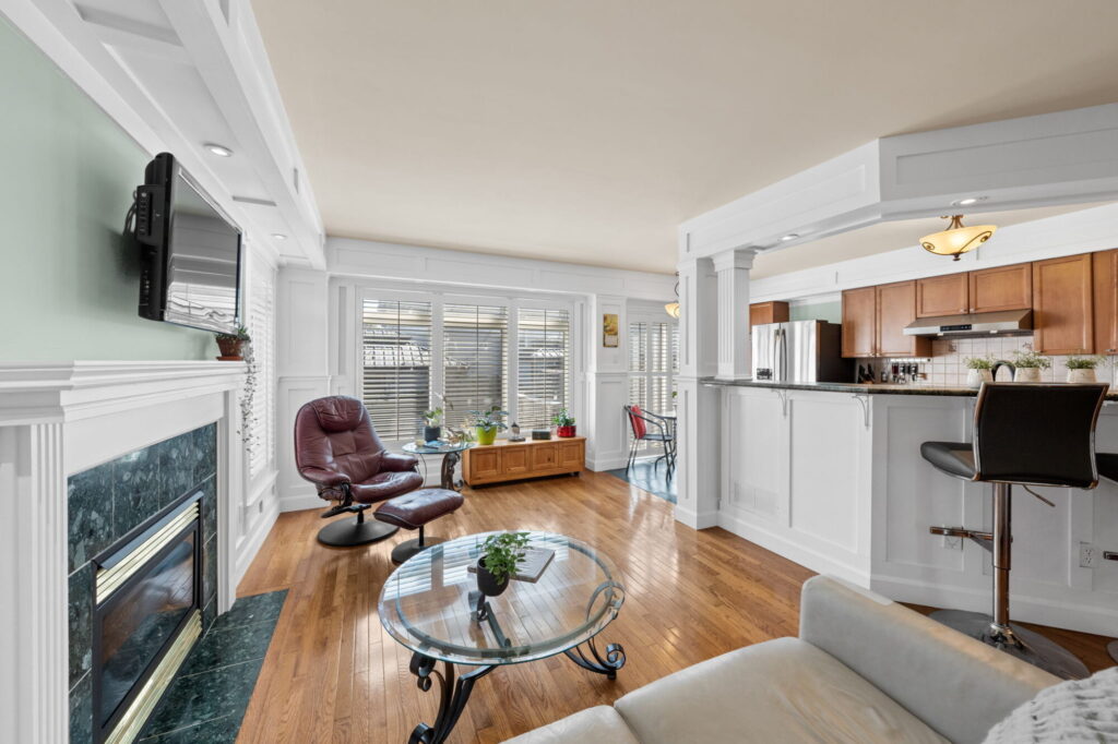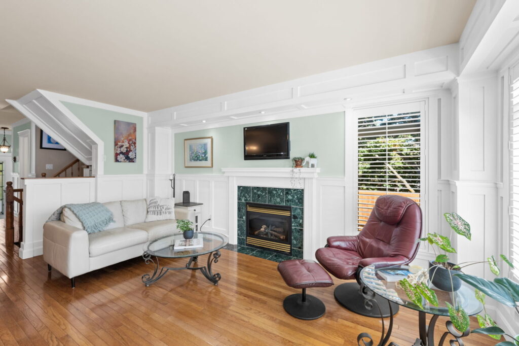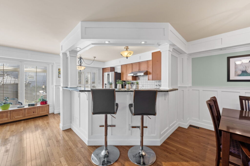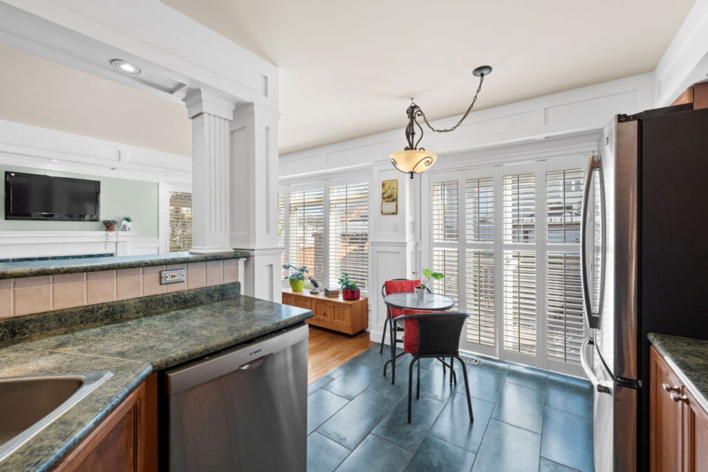A tiled foyer with additional custom windows sets the tone, drawing you in from the wraparound front porch. The entry also provides convenient access to the garage and a stylish powder room. Inside, you’ll find hardwood flooring, custom craftsman-style wainscotting, pot lights, and elegant custom shutters on every window. The kitchen is thoughtfully designed with abundant cabinetry, ample counter space, and a breakfast bar — the perfect spot for everyday meals or entertaining.