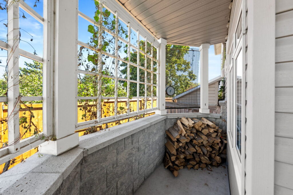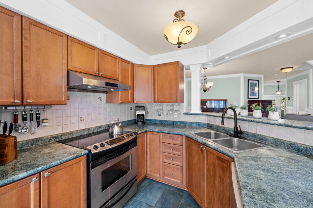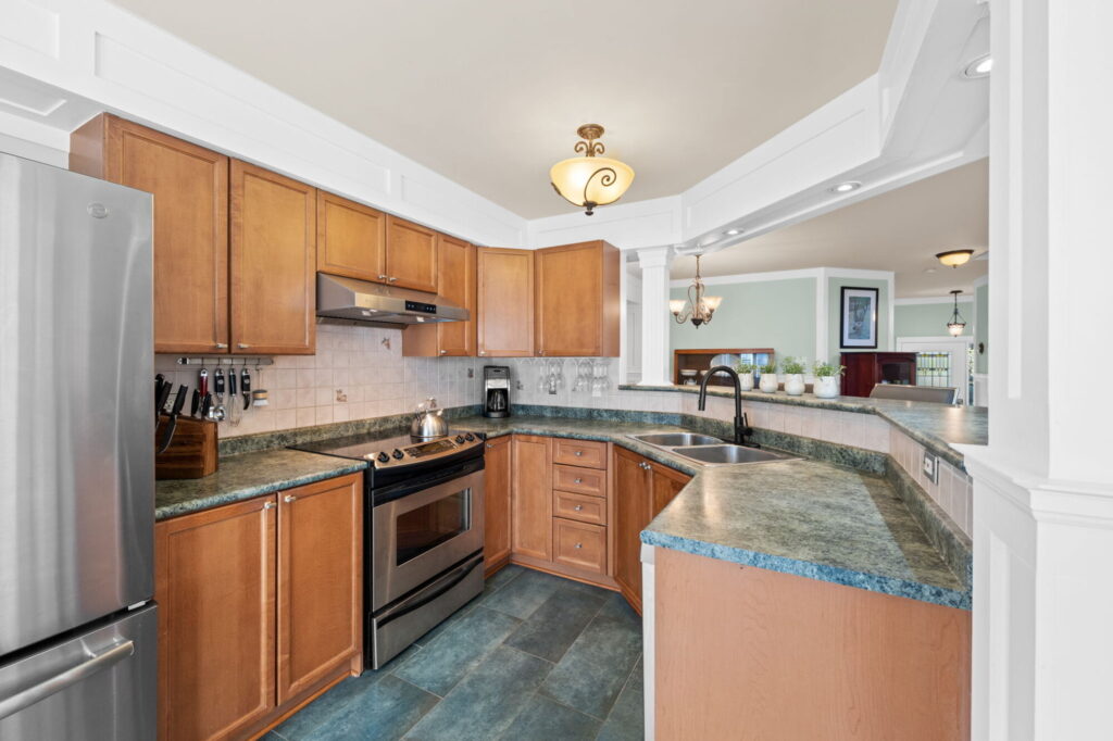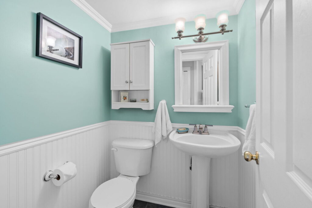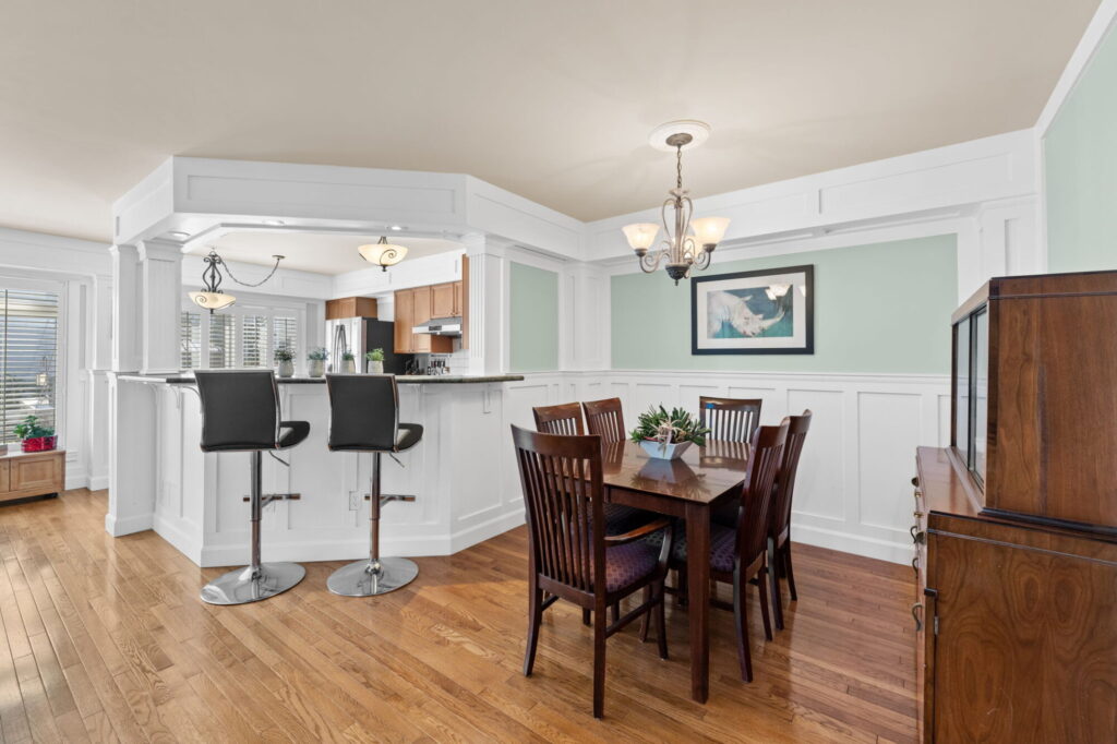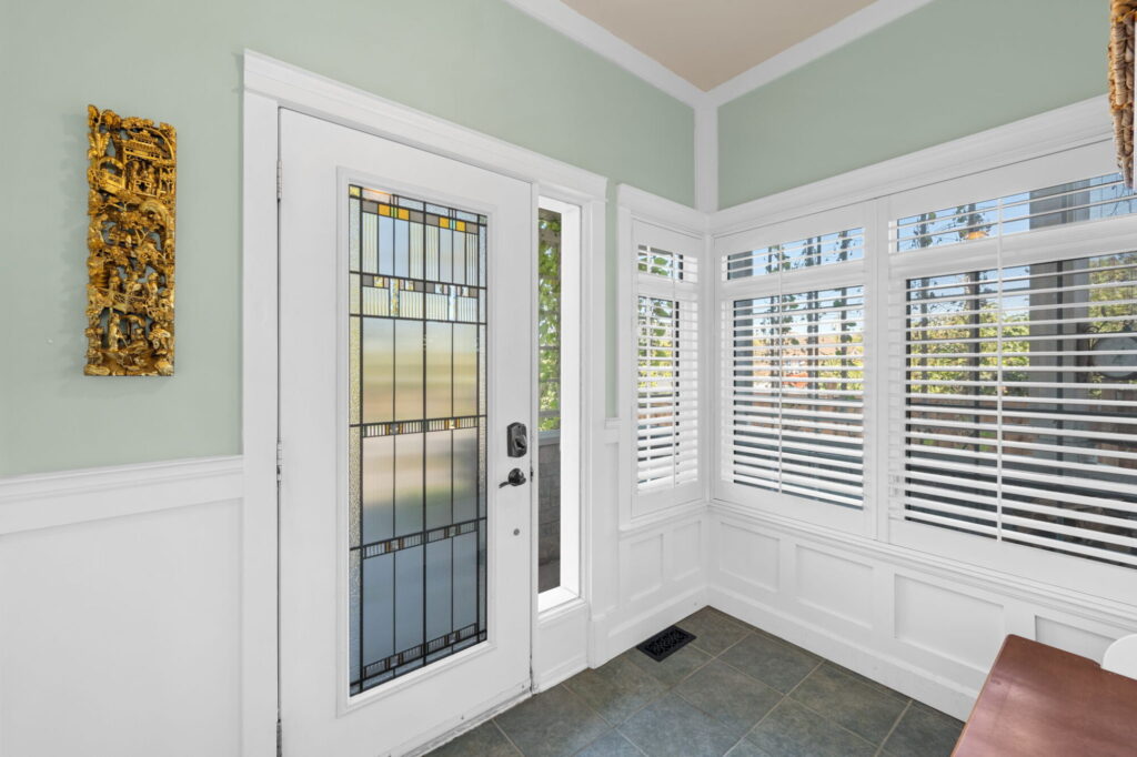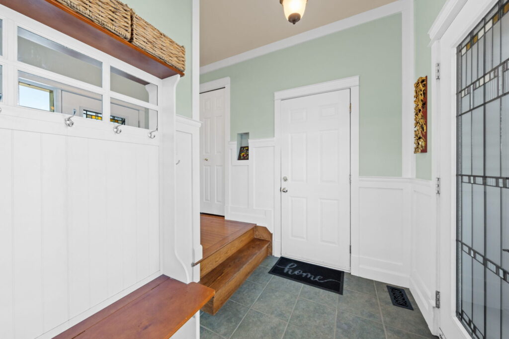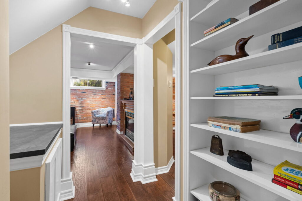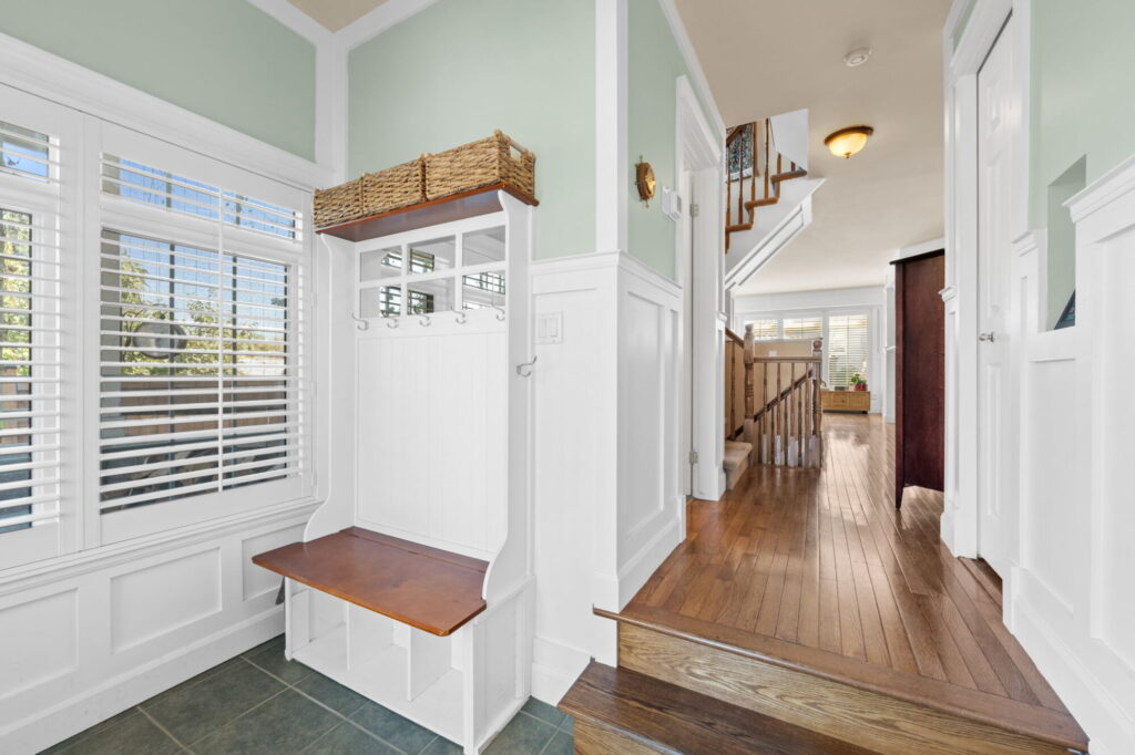 A tiled foyer with additional custom windows sets the tone, drawing you in from the wraparound front porch. The entry also provides convenient access to the garage and a stylish powder room. Inside, you’ll find hardwood flooring, custom craftsman-style wainscotting, pot lights, and elegant custom shutters on every window. The kitchen is thoughtfully designed with abundant cabinetry, ample counter space, and a breakfast bar — the perfect spot for everyday meals or entertaining.