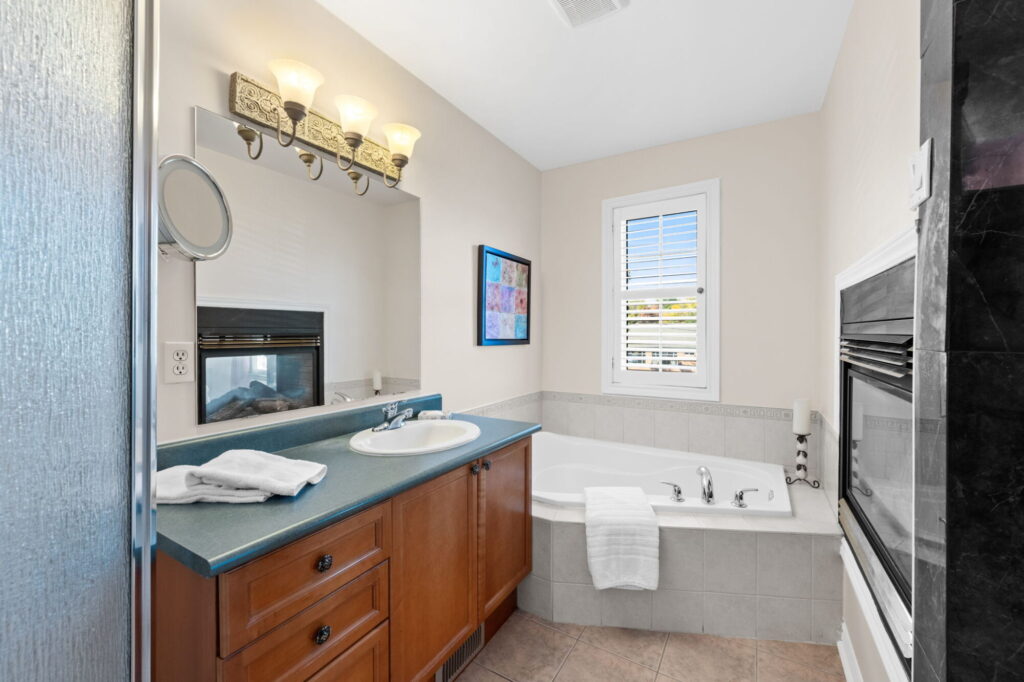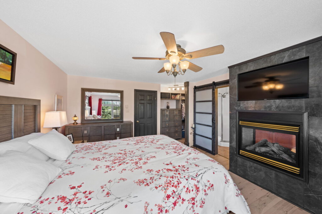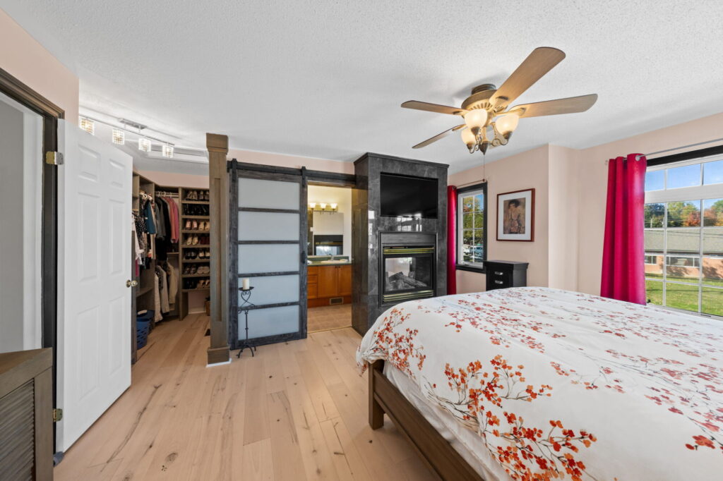 Upstairs, the primary suite is a true showpiece. Enjoy a large customized walk-in closet, beautiful flooring, and a double-sided fireplace that creates warmth and romance in both the bedroom and the spa-inspired ensuite. The ensuite features a luxurious roman tub and a separate shower. Two additional bedrooms and a full bath complete the level, including one room with custom millwork — an ideal home office, study, or craft space.