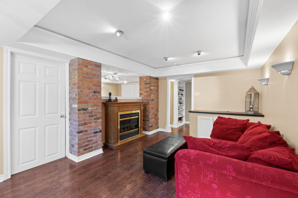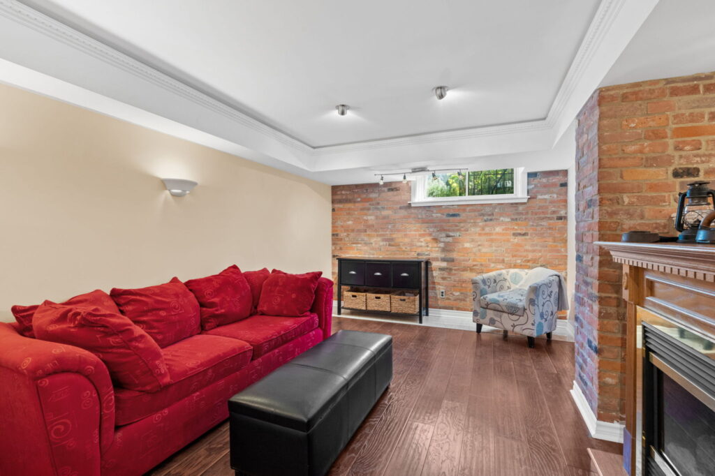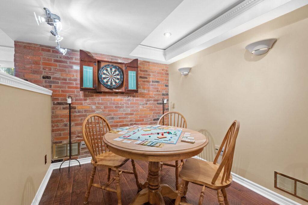 The finished lower level is designed for gathering. Exposed brick accents, a cozy family room, and a custom games area with dart board make it perfect for movie nights, game nights, or casual evenings with friends.