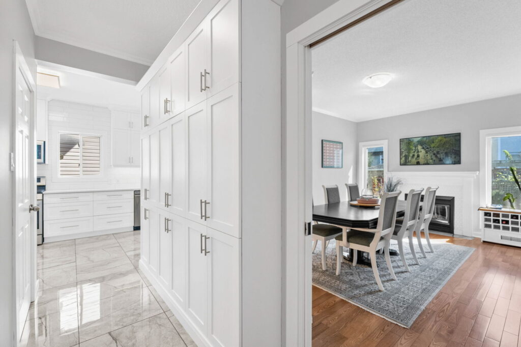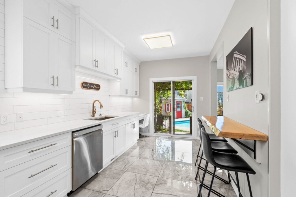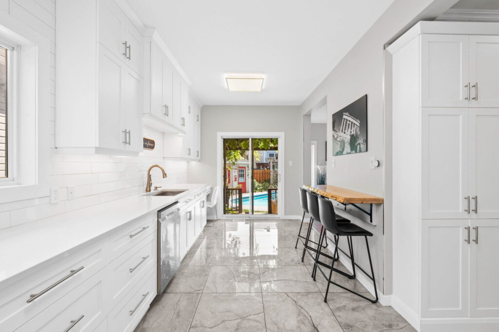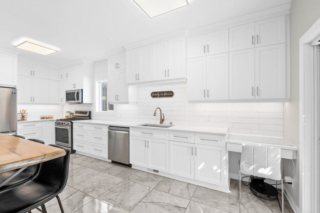 The main level flows seamlessly with hardwood flooring, showcasing a custom-built private office with barn door and built-ins, spacious living room filled with natural light, and formal dining room with gas fireplace. The heart of the home is the stunning eat-in kitchen with crisp white cabinetry, stainless steel appliances, gas stove, tiled backsplash, and marble flooring. A built-in breakfast bar and desk nook add functionality, while direct backyard access makes entertaining effortless. The main floor laundry doubles as a pantry with additional storage.