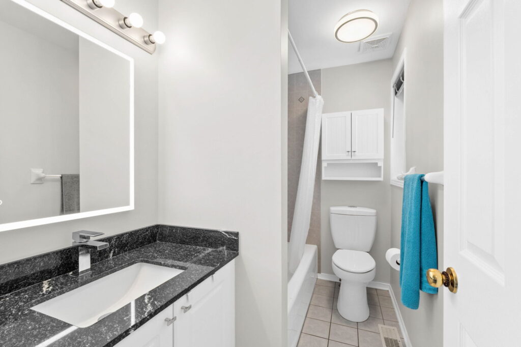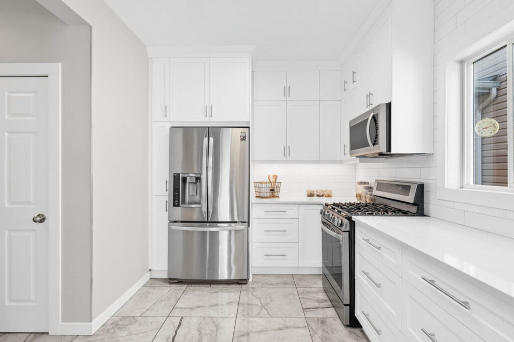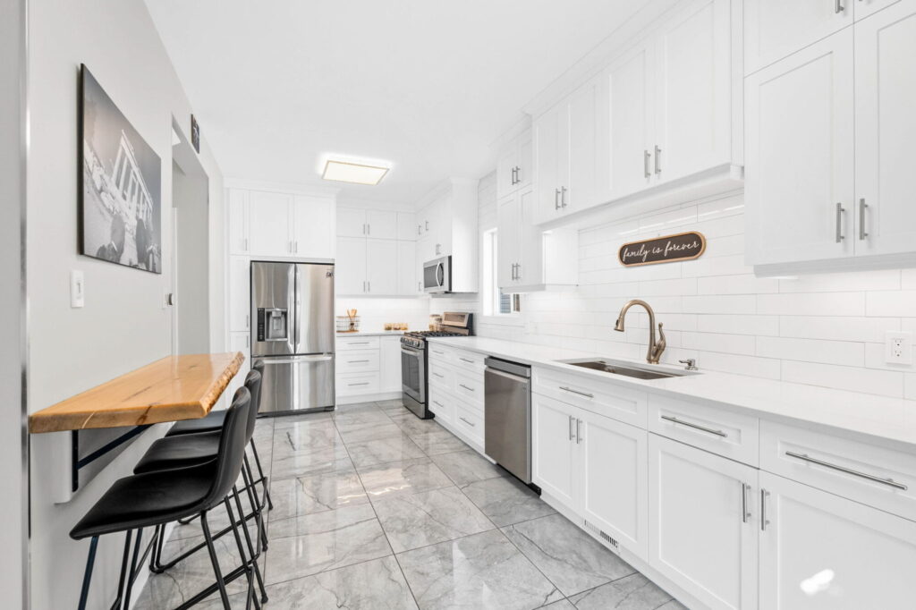 - Stunning eat-in kitchen - White cabinetry, stainless steel appliances, gas stove, marble-design flooring
