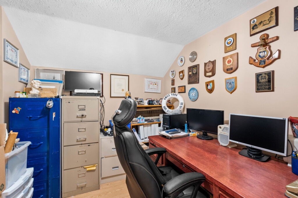 The fully finished lower level expands living space with a large rec room, 4th bathroom, additional office/den, storage room, and workshop.