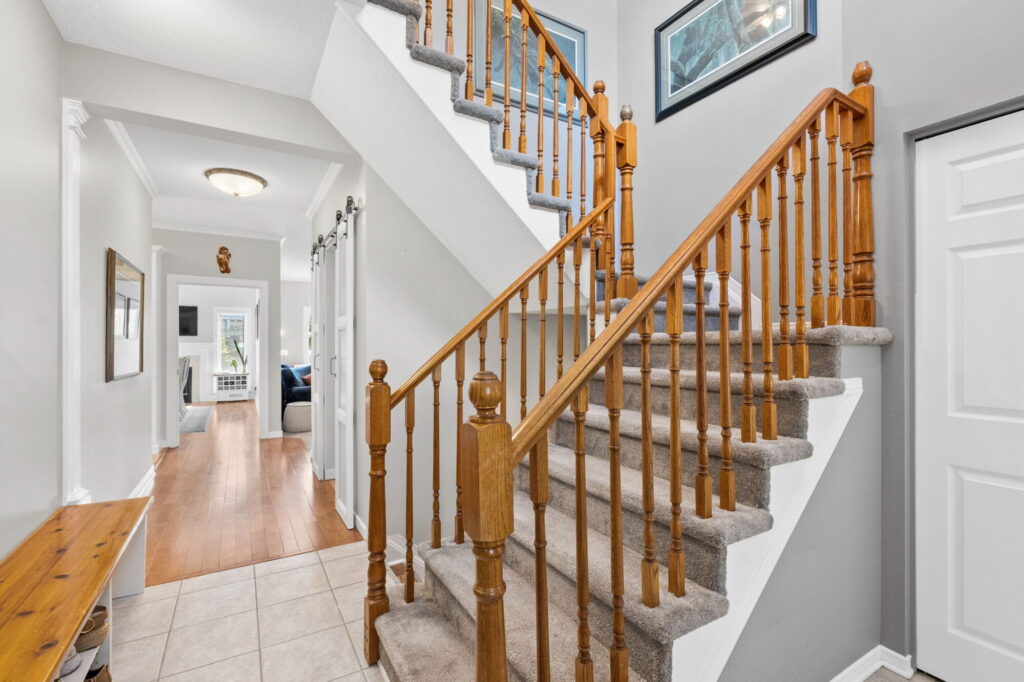 Upstairs, three generously sized bedrooms include a primary suite with his-and-hers custom closets and luxurious 5-piece ensuite featuring soaker tub and separate shower. Two additional bright bedrooms with crown mouldings share a full bathroom.