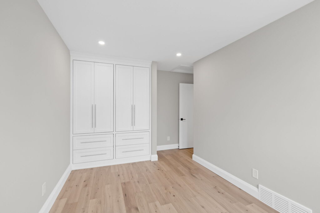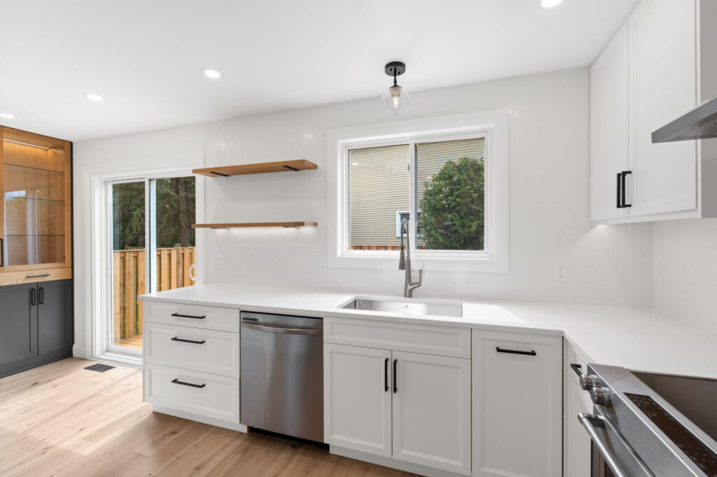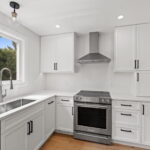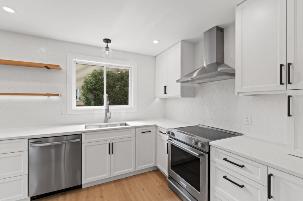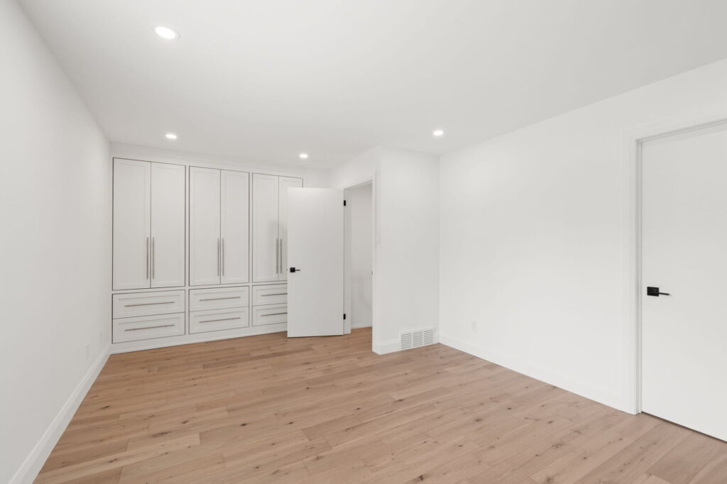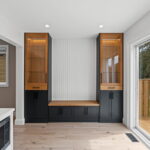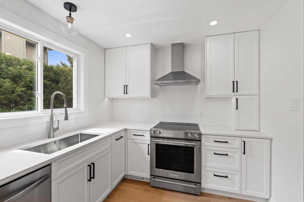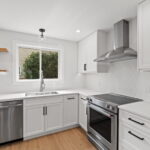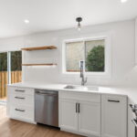 The heart of the home lies in the fully redesigned kitchen, where white quartz countertops, a sleek tiled backsplash, and large soft-close drawers are paired with ample custom cabinetry and built-in storage in the eating area. Whether you’re hosting or cooking nightly dinners, the kitchen delivers with premium appliances, a deep stainless steel basin sink, and a tall gooseneck faucet, providing both beauty and everyday functionality.