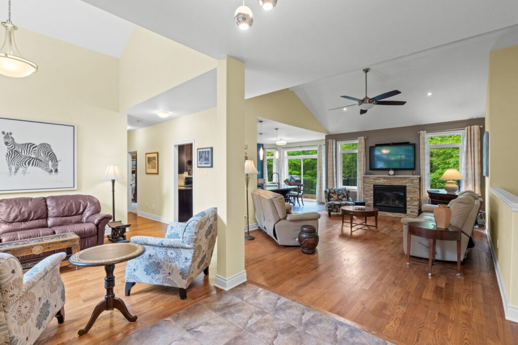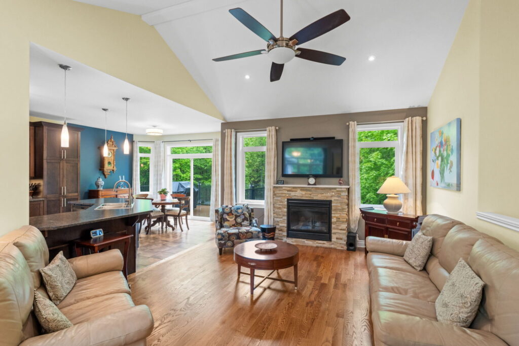 The inviting living room features a propane fireplace with a striking stone surround, complemented by hardwood flooring, updated lighting, and ceiling fans that add both style and warmth.