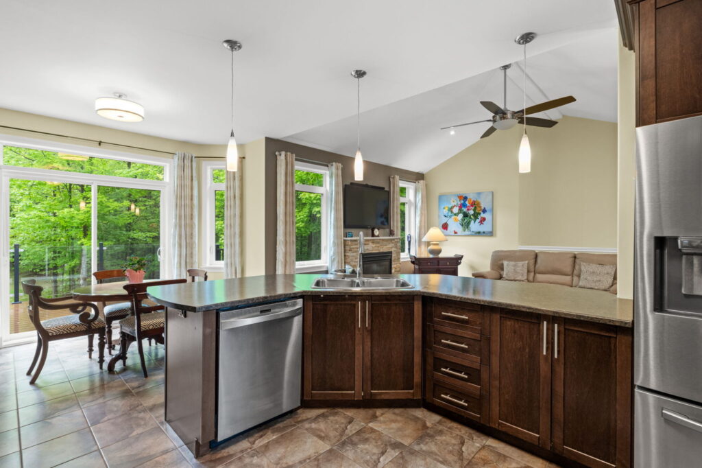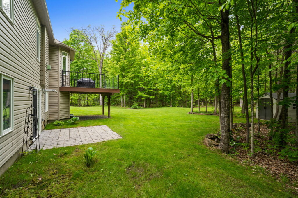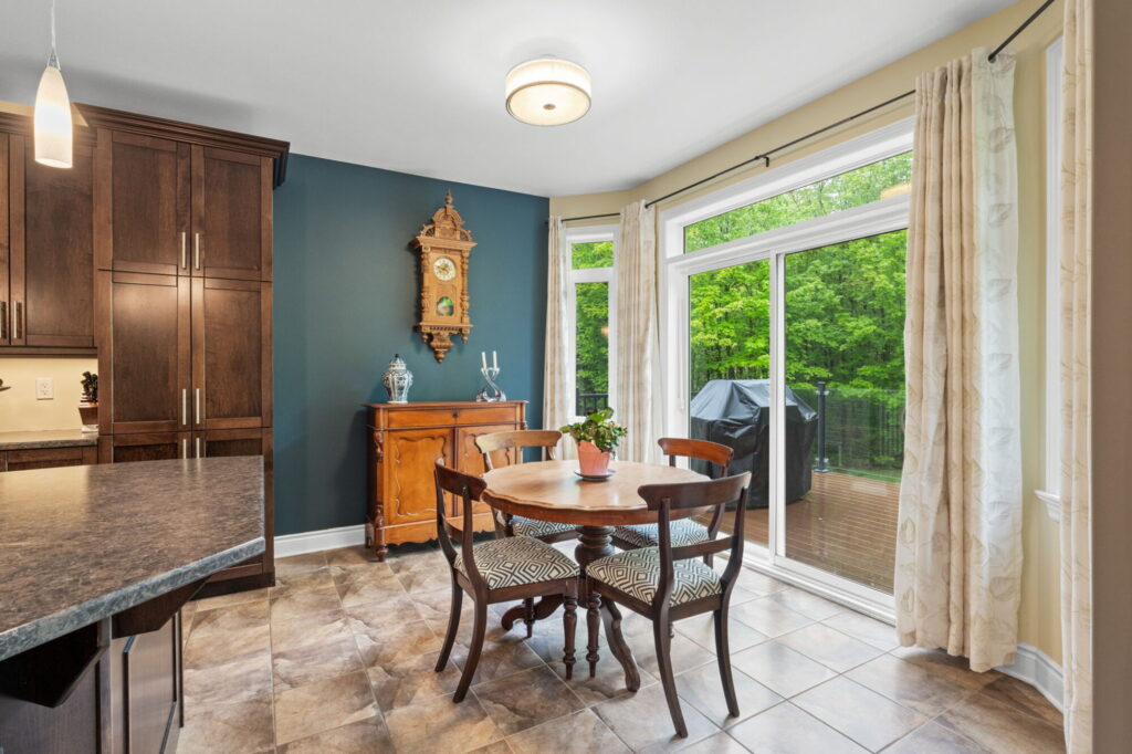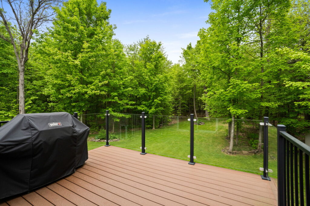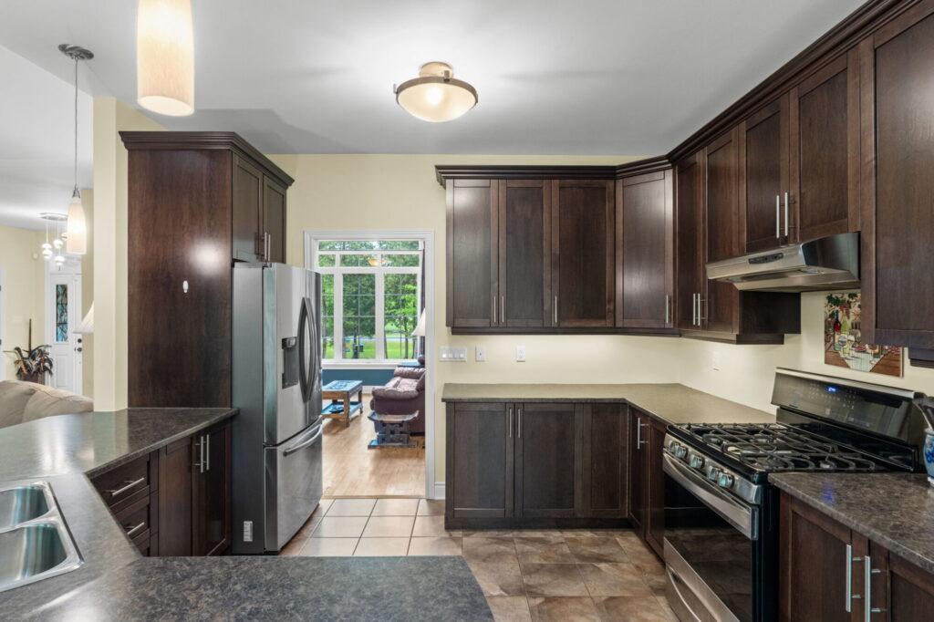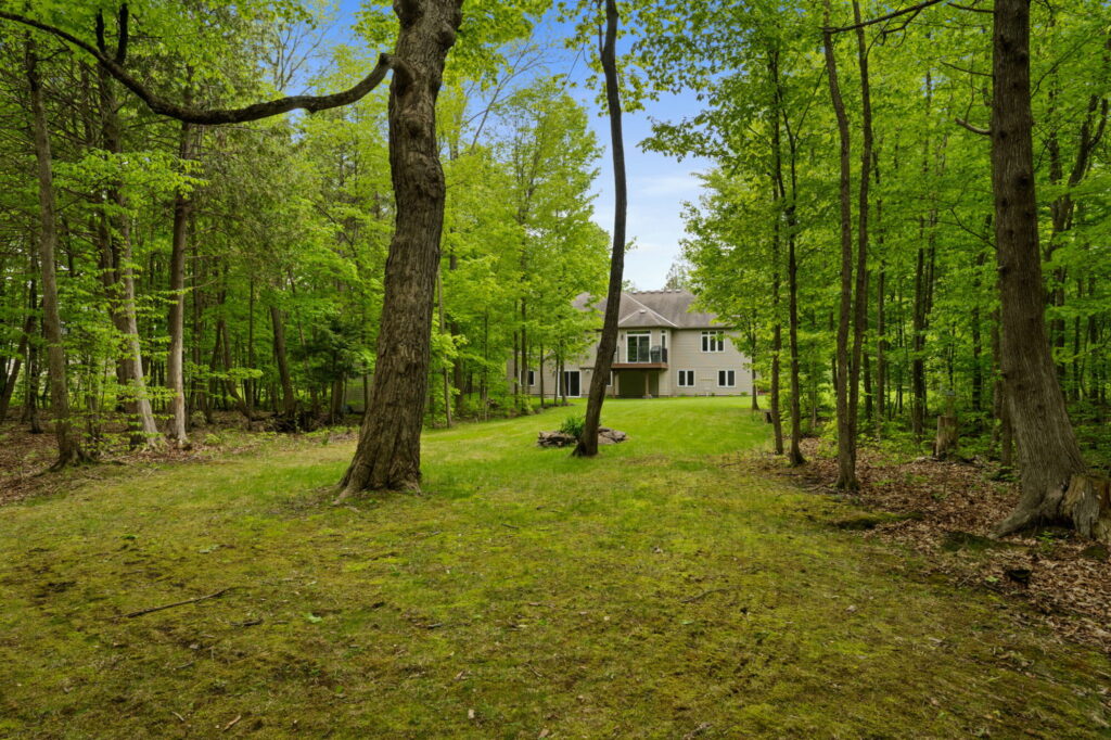 The chef’s kitchen is a dream: abundant counter space, stainless steel appliances, a gas stove, breakfast bar, pendant lighting, and ample cabinetry for all your storage needs. Just off the kitchen, step onto a large deck that overlooks the expansive backyard and tranquil forest — the ideal spot for morning coffee or evening relaxation.