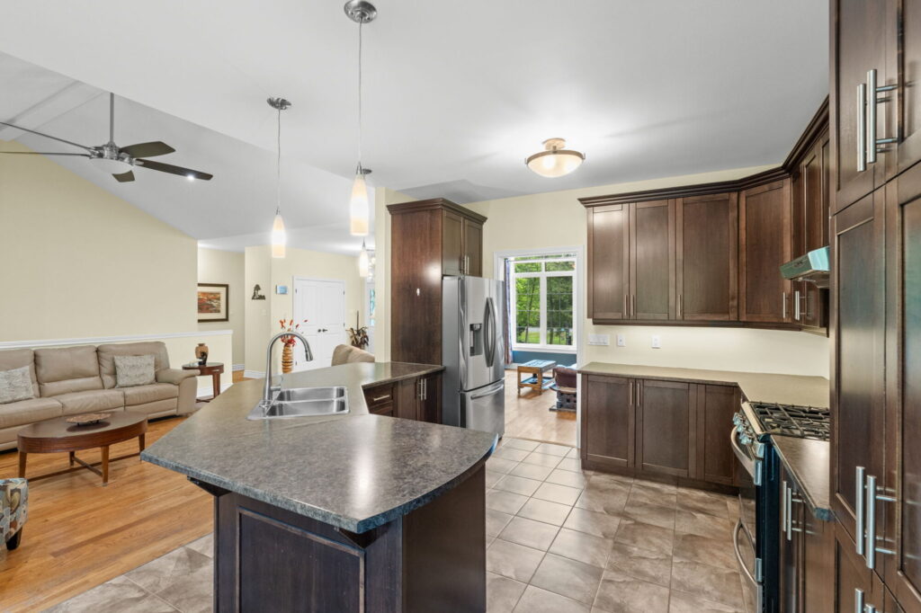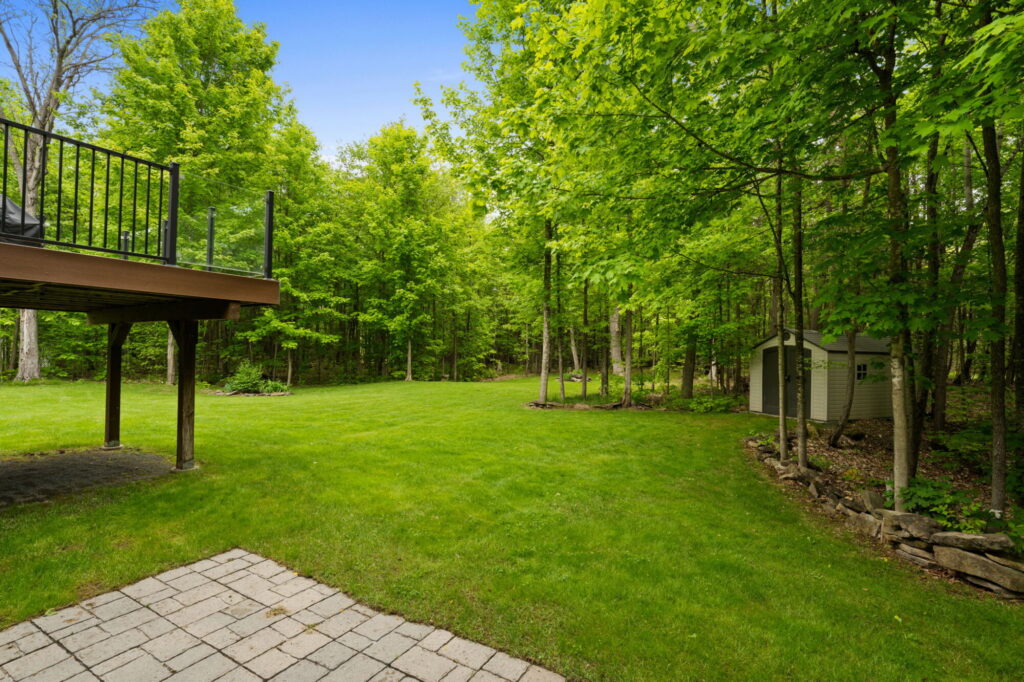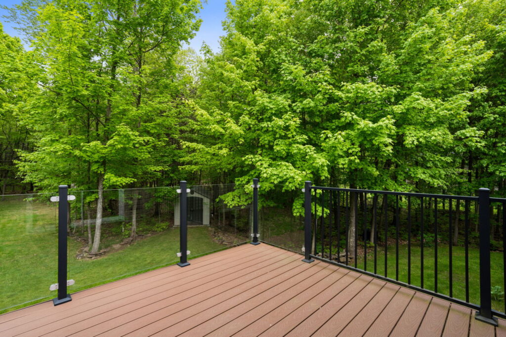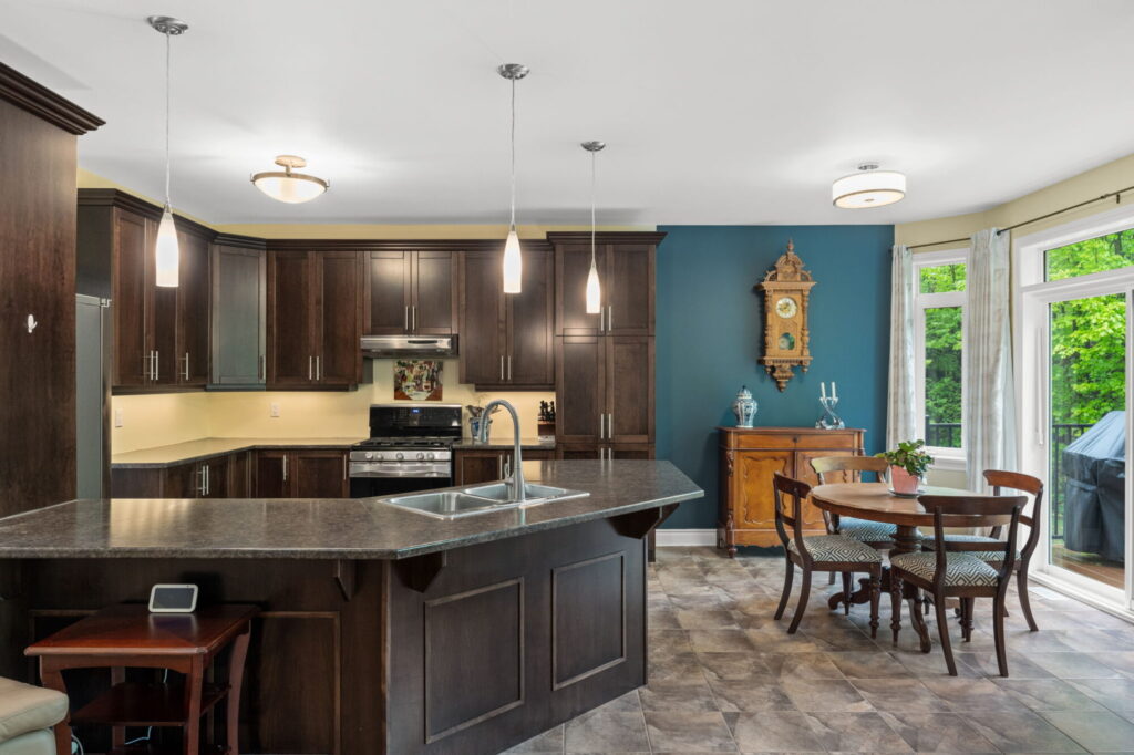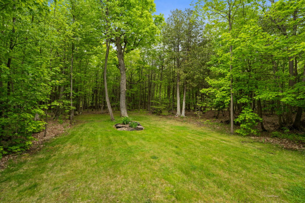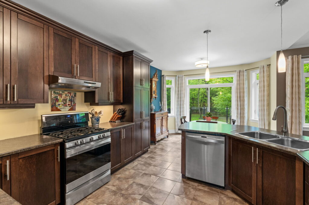 The chef’s kitchen is a dream: abundant counter space, stainless steel appliances, a gas stove, breakfast bar, pendant lighting, and ample cabinetry for all your storage needs. Just off the kitchen, step onto a large deck that overlooks the expansive backyard and tranquil forest — the ideal spot for morning coffee or evening relaxation.