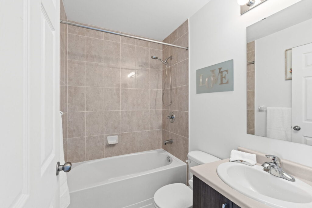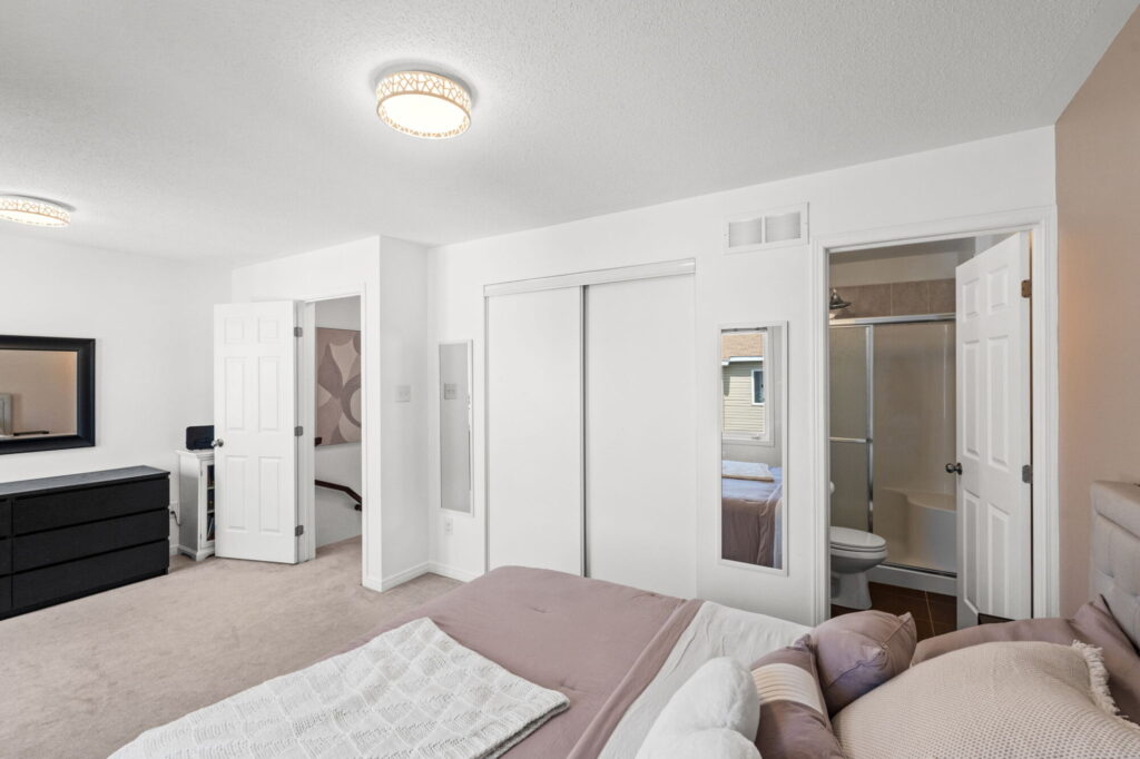 The top floor features three well-sized bedrooms, each with custom blinds. The spacious primary bedroom boasts a 3-piece ensuite with tile flooring and an upgraded shower head. A second full bathroom includes a tub/shower combo and upgraded fixtures.