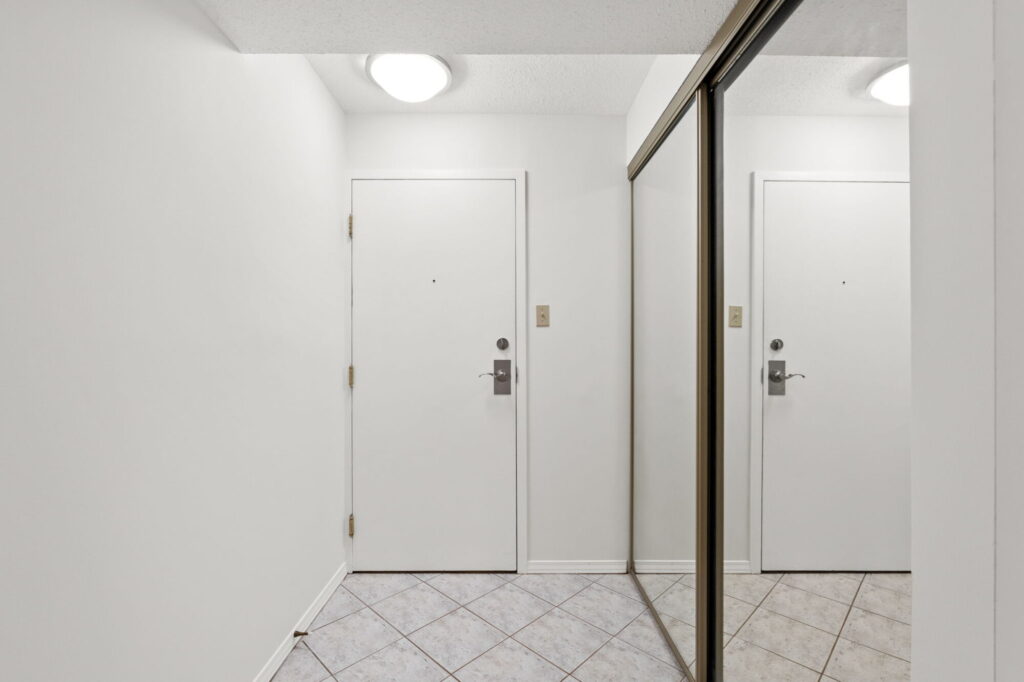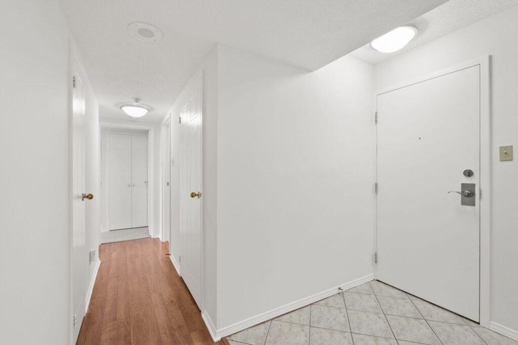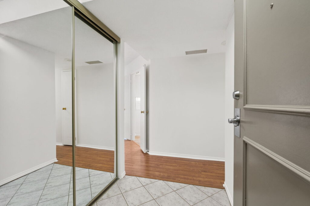 Step into a tiled foyer with a large closet and continue into the open-concept living and dining area featuring updated vinyl flooring, creating an inviting atmosphere, and a large patio door leading to a private balcony with stunning views of the city skyline and surrounding greenery.