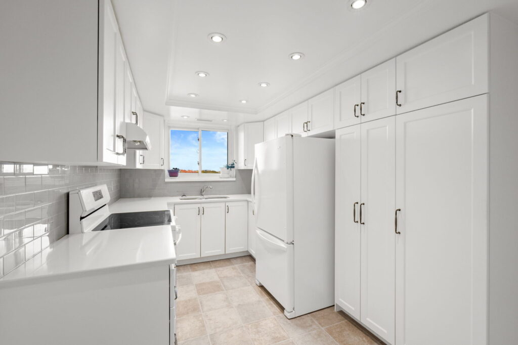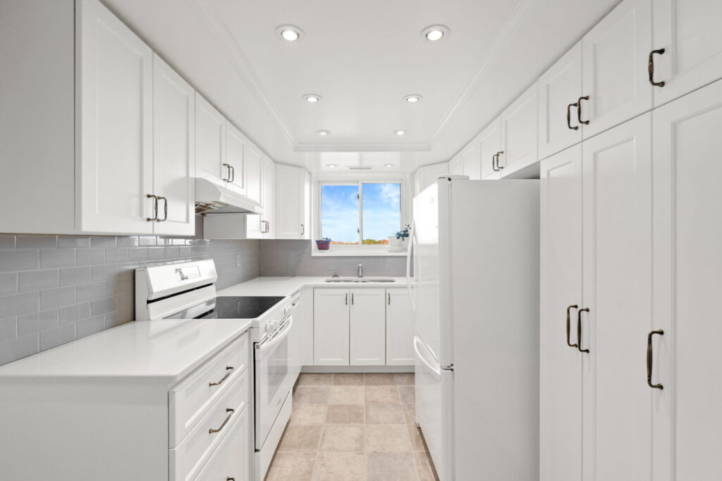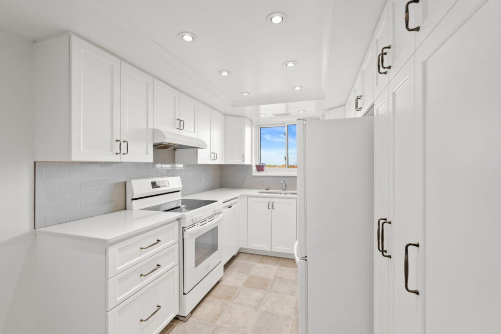 - Updated white kitchen with tiled backsplash, custom pot lights, and abundant cabinetry