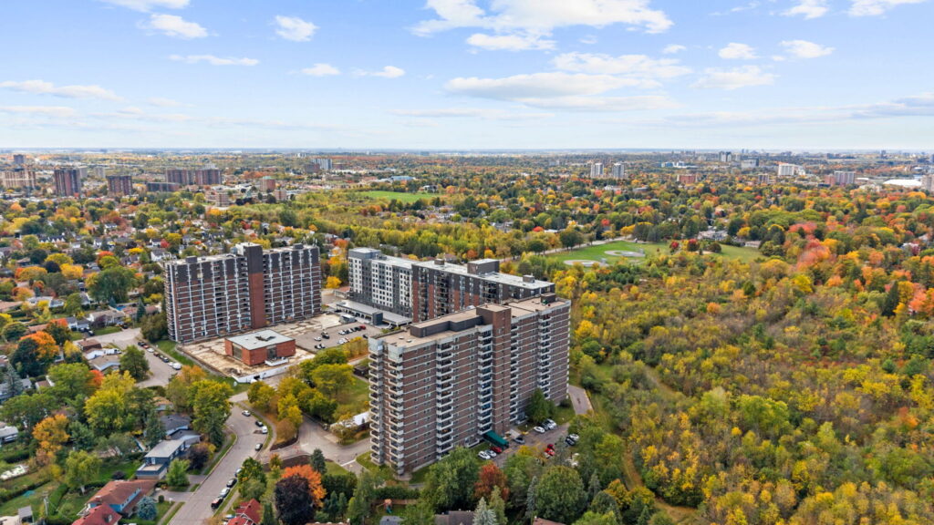 - Approximately 1,244 sq ft of bright, open living space with forest and downtown skyline views